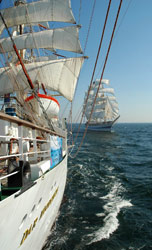 Regaty przebiegały w bardzo trudnych warunkach, bo… czasem prawie bez wiatru. Mówi się, że dobrego żeglarza poznaje się właśnie w takich warunkach. Przy stałym wietrze, nawet silnym rzecz polega na ustawieniu żaglowca na kursie i odpowiednim ustawieniu żagli. Czy też redukcji żagli. Choć nie należy bagatelizować, bo jednak dużą rolę odgrywa też odporność załogi przy dużym zafalowaniu, ustawicznej wilgoci, pracy w bryzgach rozbijanej dziobem fali czy też zalewanym wodą pokładzie. Ale „łapanie” najmniejszego podmuchu wiatru, nieustanna czujność, aby wyłapać wiatrowe „odkrętki” i to czujność przez długie okresy czasu, bo przecież żaglowiec płynie dużo wolniej niż przy stałym wietrze, to też próba charakterów i cierpliwości. Załoga „Daru” wygrała tę próbę. Bo to była nieustanna czujność oficerów jeżeli chodzi o kierunek i lekkie „dmuszki” wiatru, gotowość załogi stałej na wiecznym „stand-by”, aby w odpowiedni sposób pokierować pracą na pokładzie i entuzjazm co chwila wyrywanych dzwonkami alarmowymi studentów do manewrów, zwrotów czy też tylko trymowania żagli. Ten bieg był dobrą okazją do pokazania studentom tej jakże potrzebnej na morzu cierpliwości, pracy zespołowej i wspólnego osiągnięcia celu. Informowani na bieżąco o rozwoju sytuacji, oczekiwanych manewrach i celu tej całej „zabawy” zaangażowali się. Trzeba powiedzieć, że to była okazja do podniesienia poziomu szkolenia. I dlatego „Dar” bierze co roku udział w regatach Tall Ships, potwierdzając swoją obecność licznymi zwycięstwami. I w tym roku to trzecie miejsce potwierdziło zgranie i zaangażowanie załogi.