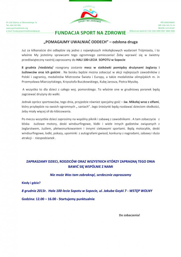 W dniu 8 grudnia br. Fundacja Sport na Zdrowie organizować będzie w Sopocie mecz siatkówki pomiędzy drużynami żeglarzy i żużlowców. Na boisku będzie można zobaczyć w akcji najlepszych zawodników z Polski i zagranicy, medalistów Mistrzostw Świata i Europy, a także medalistów olimpijskich m. in  Przemysława Miarczyńskiego, Krzysztofa Buczkowskiego, Kubę Jarosza, Piotra Myszkę. A wszystko to dla dzieci z całego woj. pomorskiego. To właśnie one w grudniowy poranek będą zagrzewać drużyny do walki.