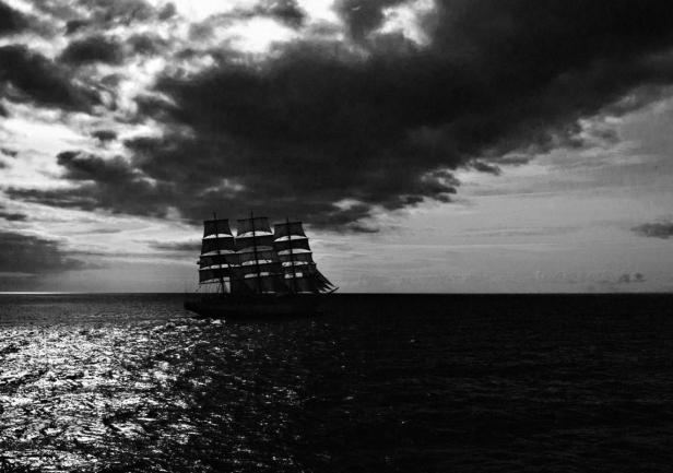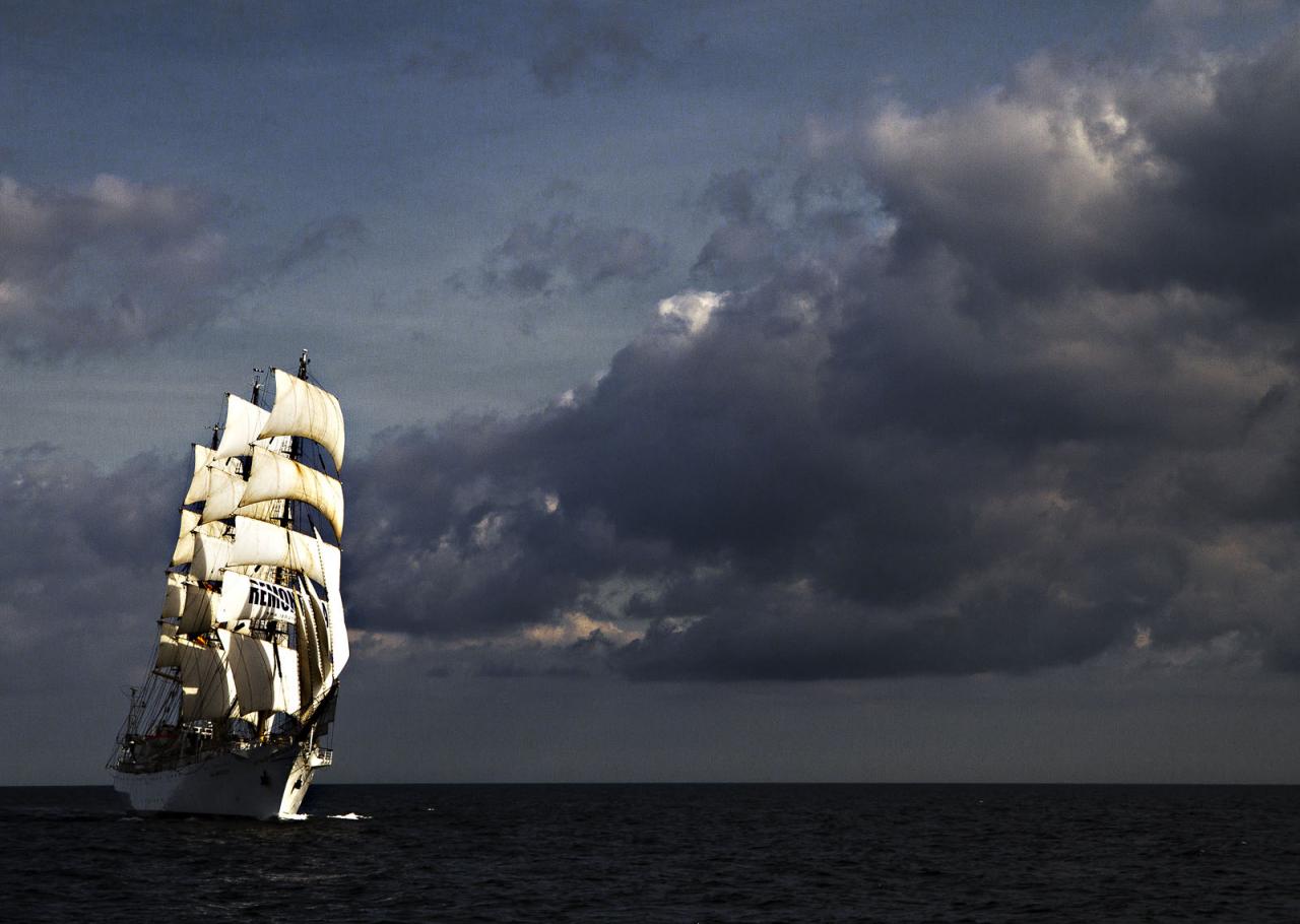 Na trasie z Gdyni pogoda nas nie rozpieszczała - najpierw sztorm na Bałtyku, potem przeciwne wiatry na Morzu Północnym i w Kanale Angielskim. Jak tylko to było możliwe płynęliśmy na żaglach i praktykanci mogli sprawdzić się w ciężkich warunkach. Wielu z nich oddało "cześć" Neptunowi, ale większość była bardzo dzielna.