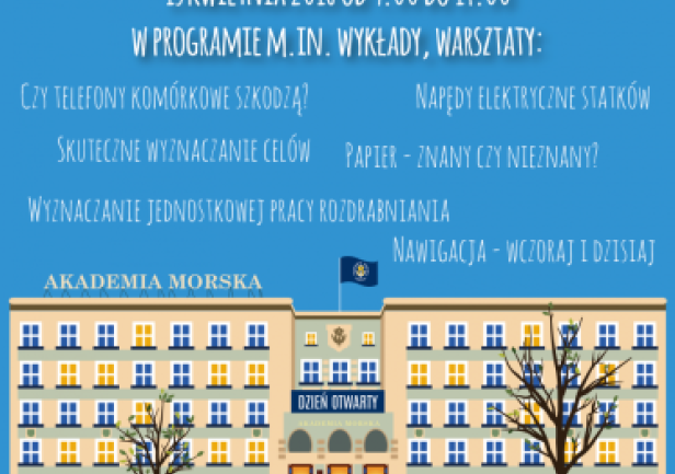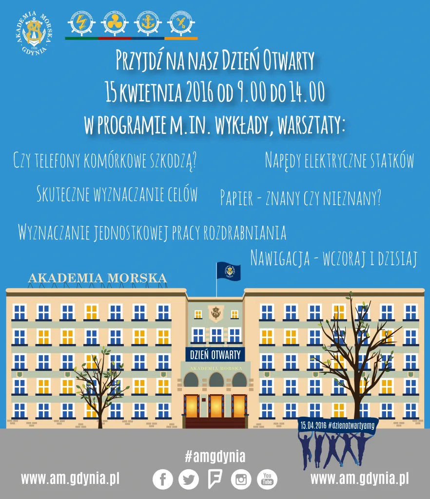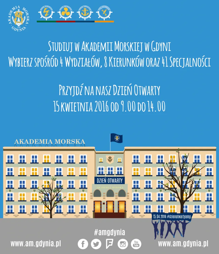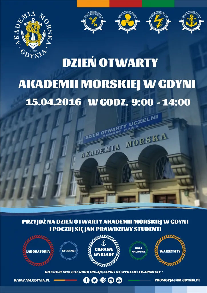 Już 15 kwietnia 2016 roku w godzinach 9:00 - 14:00 serdecznie zapraszamy wszystkich uczniów szkół ponadgimnazjalnych i nauczycieli na Dzień Otwarty Akademii Morskiej w Gdyni, który odbędzie się w budynku głównym uczelni (ul. Morska 81-87, Gdynia) oraz w budynku Wydziału Nawigacyjnego (al. Jana Pawła II 3, Skwer Kościuszki w Gdyni). Podczas Dnia Otwartego studenci opowiedzą o uczelni, tajnikach studiowania oraz życiu studenckim.