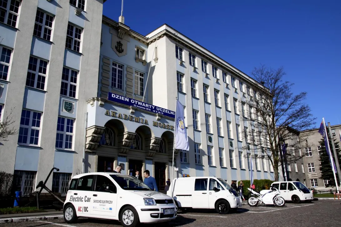 Przed budynkiem głównym Akademii Morskiej w Gdyni Koło Naukowe Pojazdów Elektrycznych EVPL /Wydział Elektryczny/ zaprezentowało uczniom szkół ponadgimnazjalnych pojazdy elektryczne.
