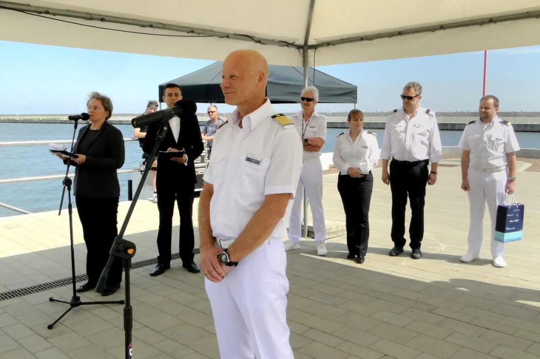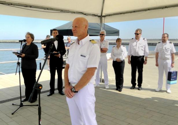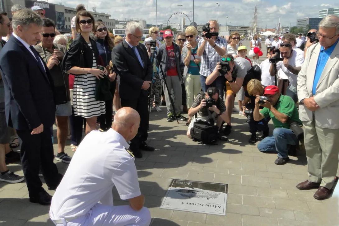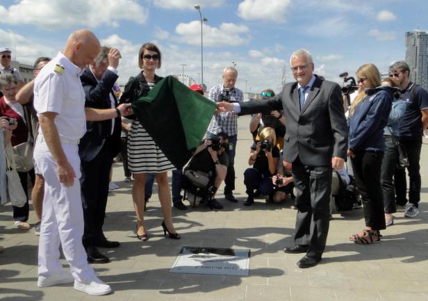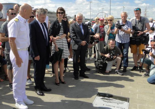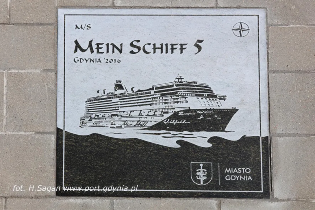 Tego samego dnia, w samo południe, w Alei Statków Pasażerskich odsłonięto kolejną tablicę - wycieczkowca "Mein Schiff 5", który zawinął do Gdyni w dziewiczej podróży. W tradycyjnej ceremonii wzięła udział wiceprezydent Gdyni pani Katarzyna Spychała-Gruszecka, kapitan statku Todd Burgman oraz nowy prezes Zarządu Morskiego Portu Gdynia  Adam Meller. W kilkuosobowej delegacji załogi "Mein Schiff 5" znalazł się także nasz absolwent Michał Sadowski, pełniący funkcję III oficera. W przeszłości kilkakrotnie wchodził w sk  ład załogi "Daru Młodzieży" - jako instruktor, a ostatnio jako II oficer. Zadeklarował, że jak w przyszłym roku zawinie ponownie do Gdyni, już na "Mein Schiff 6", postara się zapewnić kilku studentom AMG zwiedzenie statku.
