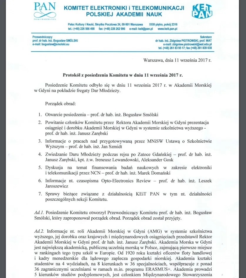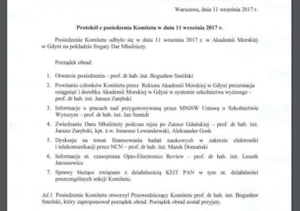 Sekretarz Komitetu, profesor Zbigniew Piotrowski załączając protokół z posiedzenia, napisał: Jeszcze raz ślicznie dziękuję za niezapomniane chwile spędzone na Darze Młodzieży podczas posiedzenia Komitetu Elektroniki i Telekomunikacji PAN. Reportaż z posiedzenia zamieściliśmy na stronie KEiT PAN.