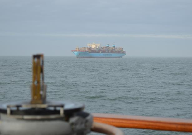 W rejonie Skagen (północny cypel Jutlandii), portu na którego redzie "Dar Młodzieży" uzupełniał paliwo, doszło do spotkania z oceanicznym gigantem - jednym z wielkich statków klasy Triple E duńskiego armatora Maersk Line - światowego potentata na rynku operatorów kontenerowych.