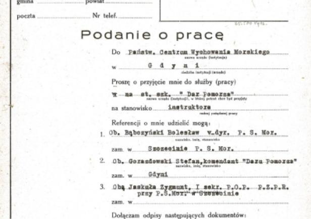 W marcu 1950 roku przyjęty został w charakterze instruktora na „Dar Pomorza”, a referencji udzielił mu m.in. komendant żaglowca kpt.ż.w. Stefan Gorazdowski.