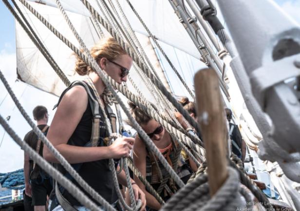 Po 19.00 wszystko było sklarowane, na masztach został tylko zestaw podstawowych żagli: dolne i górne marsle oraz sztaksle. Mam wrażenie, że średni poziom adrenaliny na pokładzie był dużo większy niż przewiduje norma. Praktykanci zmęczeni (czemu skrzętnie zaprzeczali), ale uśmiechnięci, przekonali się, że potrafią więcej niż się spodziewali, a ja, że moja wiara w nich nie była bezpodstawna. Czy ktoś zasłużył na wyróżnienie? Oczywiście, że tak - "team spirit"!