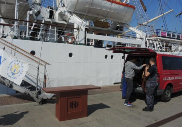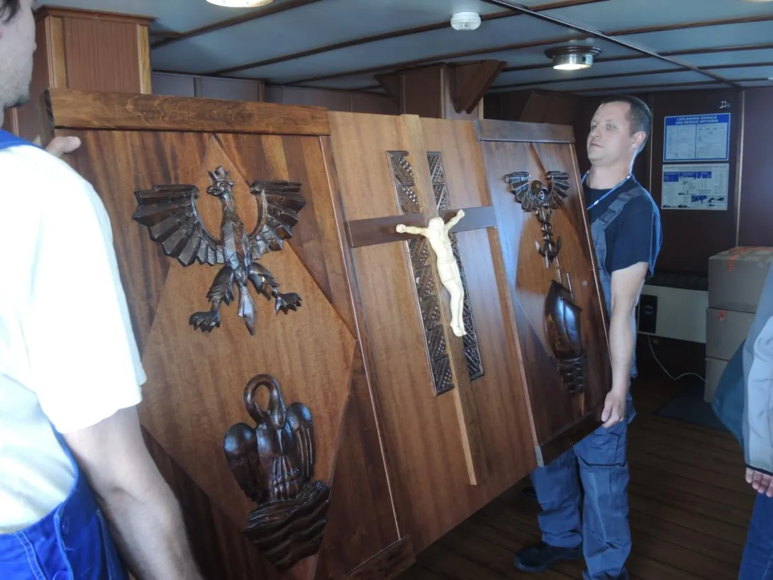 Obserwacja spod trapu: z furgonetki AMG wyłonił się niecodzienny ładunek. Monogram IHS i wszystko jasne - to mensa i nastawa ołtarza polowego, przy którym odprawiona zostanie w dniu wyjścia "Daru" msza święta. Ołtarz wyjątkowy - ufundowany na "Dar Pomorza" - od 1930 stanowił wyposażenie "białej fregaty". Wraz z wybitnym kapelanem ks. Wojciechem Kossak Główczewskim opłynął świat w latach 1934/1935, był na Hornie w 1937 roku. Po wojnie w 1949 roku skazany na zniszczenie, dzięki dzielnym ludziom ocalony, czas PRL-u przetrwał, w piwnicy na opał, prywatnym mieszkaniu, później w kościele pw. Świętej Rodziny na Grabówku. Zwrócony po zmianie ustroju Szkole, przekazany został następnie Centralnemu Muzeum Morskiemu - wrócił na pierwotne miejsce, do międzypokładu "Daru Pomorza". Na polecenie ówczesnego rektora, profesora Józefa Lisowskiego sporządzono wierną replikę - i to ona podjechała właśnie na "Dar". Na codzień stanowi wyposażenie kaplicy w Akademii Morskiej. Tyle w skrócie.