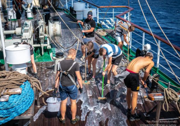 Oczywiście wymienione wcześniej czynności gospodarskie są również wykonywane w morzu. Co dobę przejmuje je inna wachta – kilkanaście osób jest wyłączonych z normalnego trybu i pracują w wyznaczonym miejscu.