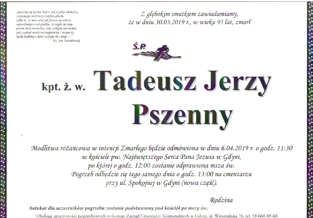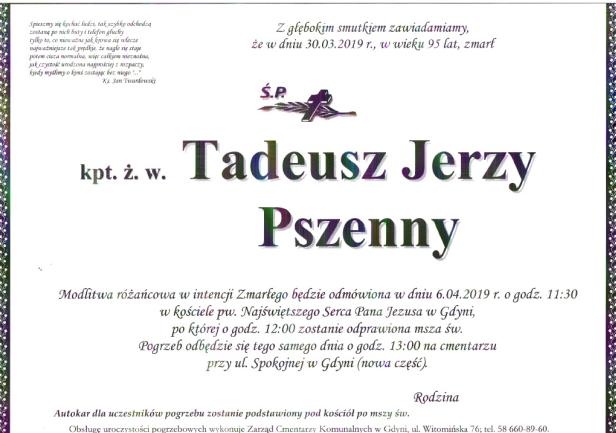 Pożegnanie śp. kpt.ż.w. Tadeusza Jerzego Pszennego - sobota 6 kwietnia b.r.: kościół pw. Najświętszego Serca Pana Jezusa w Gdyni (ul. Armii Krajowej 46)