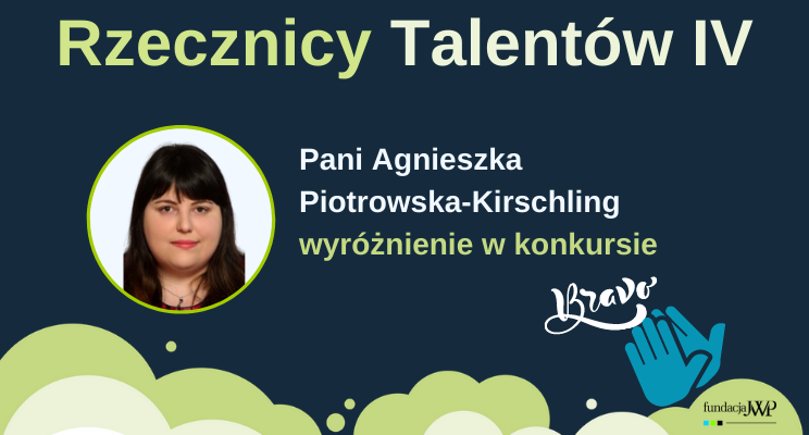 Konkurencja w konkursie o staż w ramach projektu „Rzecznicy Talentów” – edycja IV była duża. W projekcie uczestniczyli studenci, doktoranci i pracownicy z 14 ośrodków akademickich w całym kraju. Mgr Agnieszka Piotrowska-Kirschling poprawnie rozwiązała konkursowy kazus i wzięła udział w indywidualnej rozmowie on-line, uzyskując wyróżnienie i miesięczny staż w jednym z biur Kancelarii JWP Rzecznicy Patentowi.