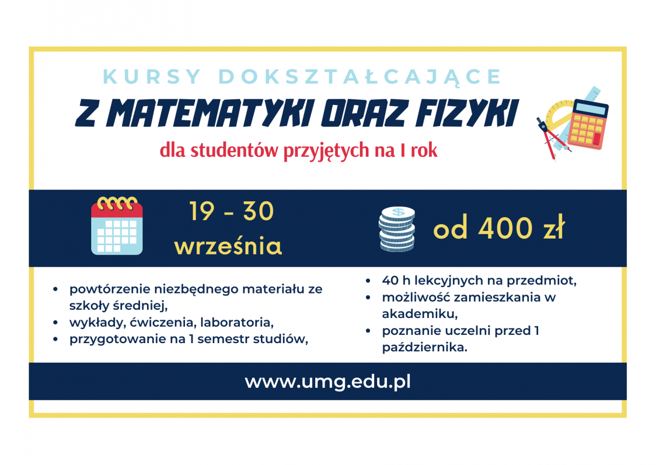 Kursy są przeznaczone dla studentów przyjętych na I rok wszystkich Wydziałów Uniwersytetu Morskiego w Gdyni, którzy chcą poszerzyć swoją wiedzę z zagadnień z matematyki i fizyki oraz ułatwić start na studiach.
