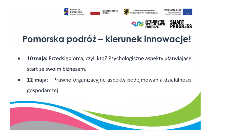 Spotkania pod hasłem: „Pomorska podróż. Kierunek Innowacje! Czyli jak skutecznie przygotować i wdrożyć projekt badawczo – rozwojowy?” odbędą się już 10 i 12 maja. W pierwszej kolejności, we wtorek, rozmawiać będziemy o psychologicznych aspektach ułatwiających start z pomysłem na biznes a następnie, w czwartek, o prawno-organizacyjnych aspektach podejmowania działalności gospodarczej.