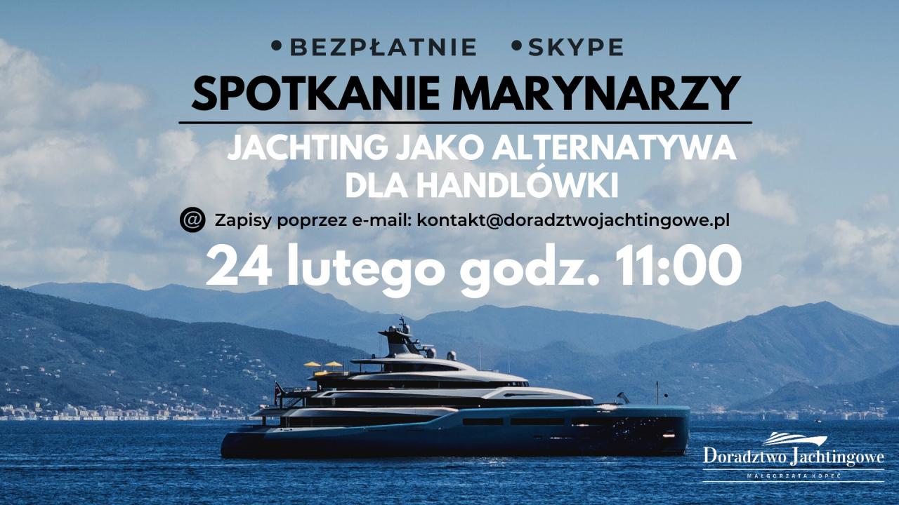 „Chcę zapisać się na szkolenie online ‘JACHTING JAKO ALTERNATYWA DLA HANDLÓWKI - SPOTKANIE MARYNARZY’. Wyrażam zgodę na przetwarzanie danych osobowych dla potrzeb rekrutacji na szkolenie oraz na przesłanie oferty handlowej”. Tytuł mejla: SPOTKANIE MARYNARZY i Twoje imię i nazwisko.
