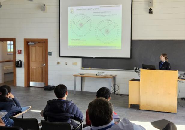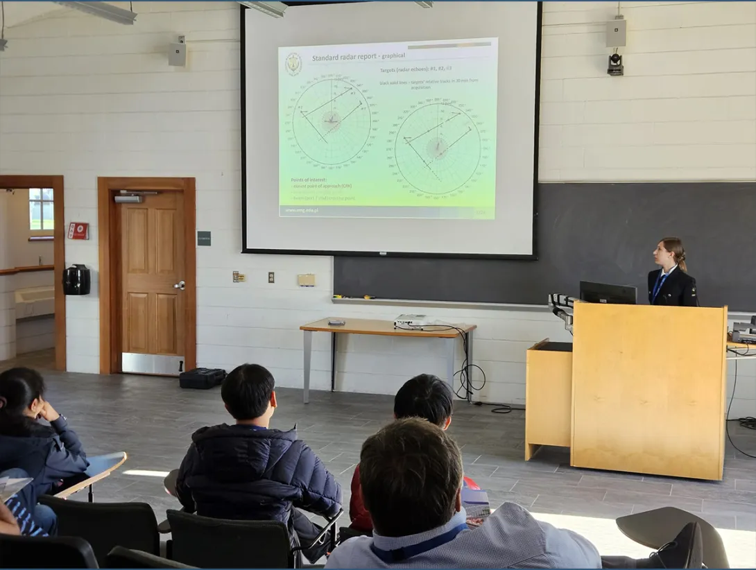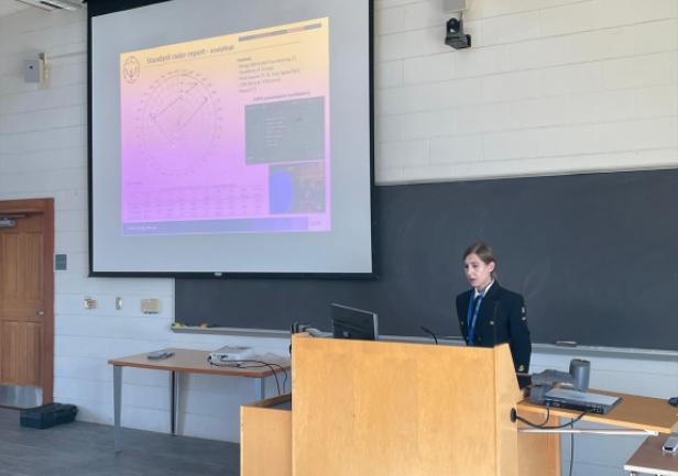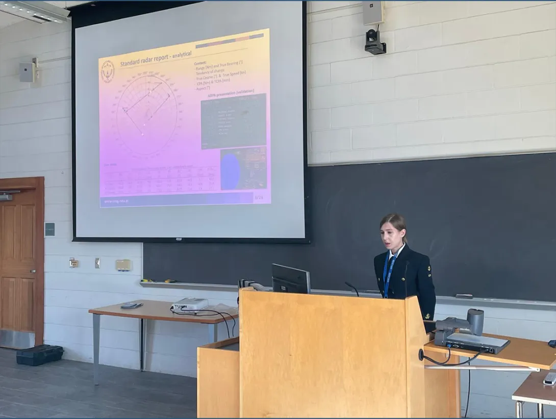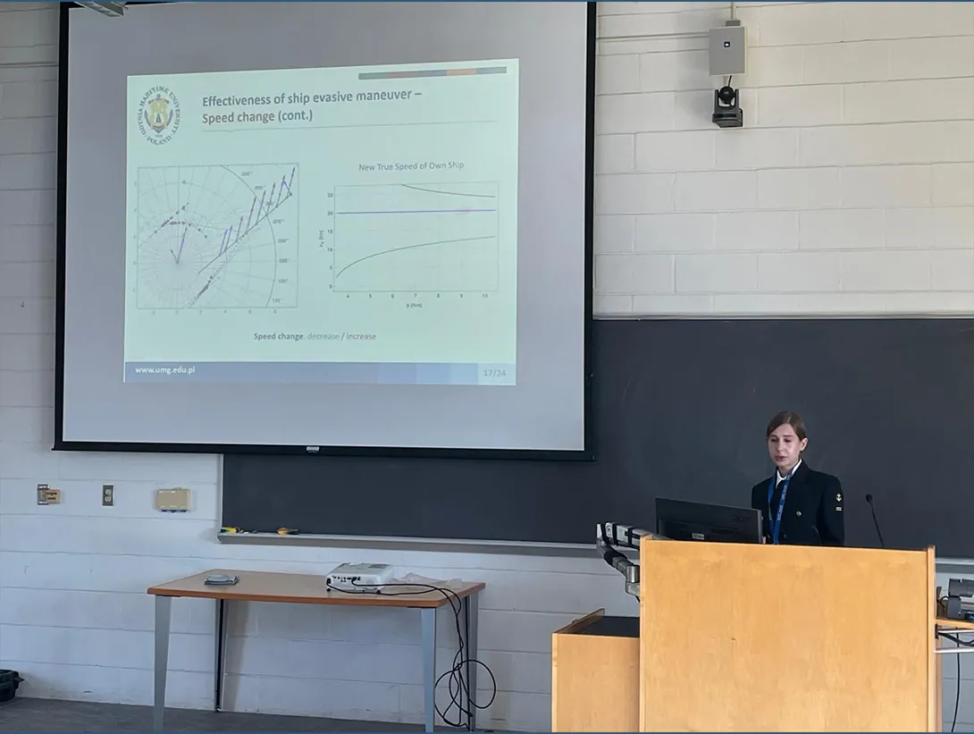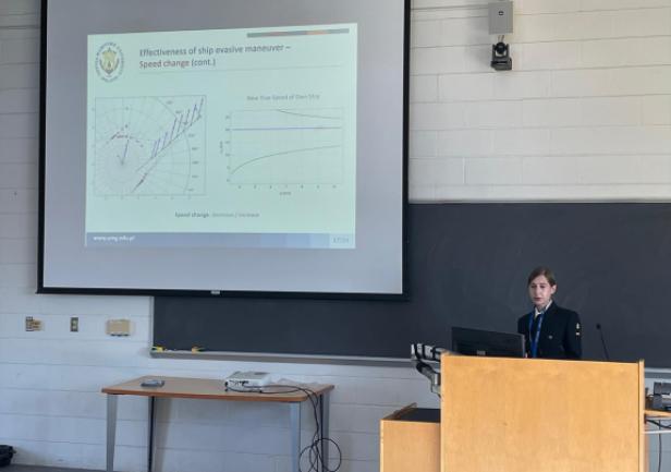 przedstawiła prezentację pt. Effectiveness of ship evasive maneuver enhanced by a comprehensive radar report przygotowaną wraz z Aleksandrą Żywuszko z Wydziału Nawigacyjnego pod kierunkiem dr. inż. kpt. ż.w. Piotra Kopacza.