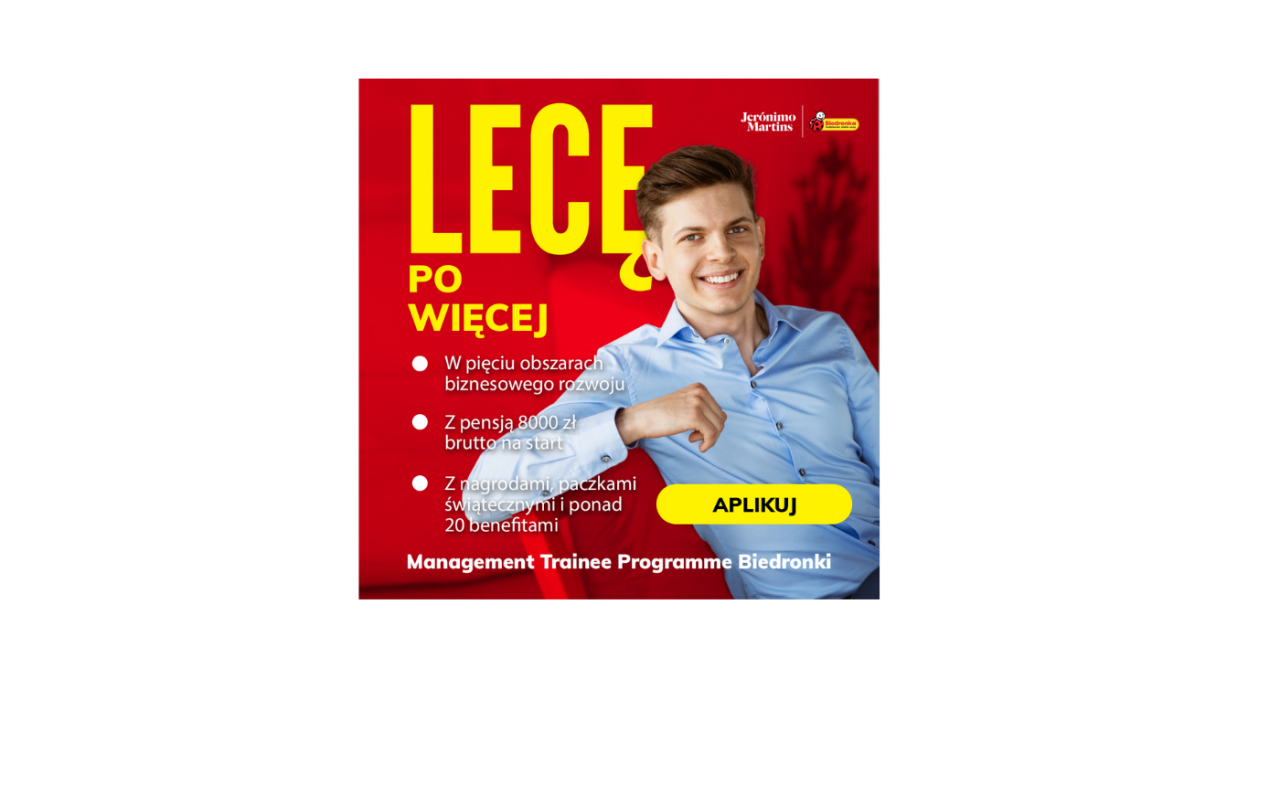 Studencie, absolwencie – lecimy po więcej! Dołącz do firmy, gdzie będziesz mieć odlotowe możliwości! Zapraszamy do aplikowania do programu Management Trainee 2024 w Biedronce. Przekonaj się, jak można rozwinąć skrzydła u największego pracodawcy w Polsce!