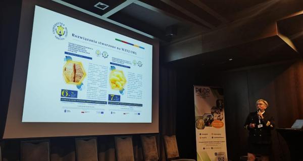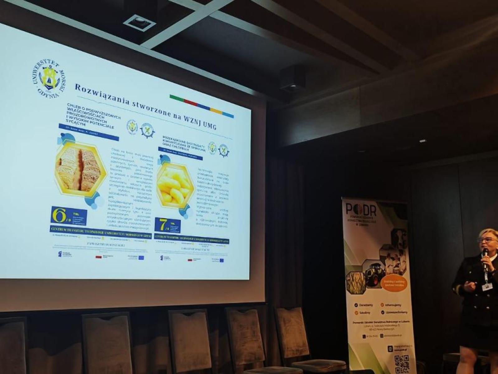 Oferta współpracy UMG dla branży rolno-spożywczej cieszyła się bardzo dużym zainteresowaniem wśród uczestników konferencji nie tylko z uwagi na interesujące rozwiązania tj. chleb o podwyższonych właściwościach prozdrowotnych, lody rzemieślnicze, przekąskowe ekstrudaty kukurydziane wzbogacone białkiem czy napoje izotoniczne (https://umg.edu.pl/portfel-aktywny), ale także z uwagi na doświadczenie i współpracę realizowaną z grupą rolników pod kierownictwem Pani Doroty Marszk w ramach Program Rozwoju Obszarów Wiejskich na lata 2014-2020 Agencji Restrukturyzacji i Modernizacji Rolnictwa w ramach realizacji projektu pn. „Zdrowa, lokalna i bezpieczna żywność bezpośrednio z gospodarstwa rolnego – innowacyjny model organizacji produkcji żywności oraz wprowadzania na rynek lokalny”. Kierownikiem projektu „Lokalnie i Funkcjonalnie” z ramienia UMG była dr inż. Joanna Newerli-Guz z Katedry Zarządzania Jakością Wydziału Zarządzania i Nauk o Jakości. W ramach projektu UMG jako jednostka naukowa opracowała receptury napojów izotonicznych na bazie soków pochodzących z owoców z gospodarstw z Pomorza (https://isodrop.pl/) oraz przeprowadziła liczne badania na etapie procesu produkcji pozwalając na wdrożenie kontroli jakości oraz ocenę produktów końcowych. Opracowane rozwiązania zostały docenione na wielu wydarzeniach, wystawach żywności regionalnej czy międzynarodowych konkursach innowacji w rolnictwie (https://maaseutuverkosto.fi/en/news/new-sports-drink-from-natural-berries-astonishing-invention-wins-innovation-competition/ ).