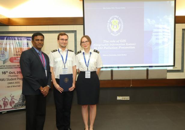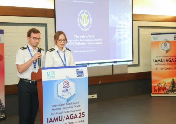 Następnie członkowie delegacji UMG przedstawili swoje referaty i postery podczas konferencji IAMUC,  której tematem przewodnim były "Technologie i Innowacje Przełomowe w Kierunku Zrównoważonych Praktyk Morskich". Doktorantka mgr W. Ceynowa i dr hab. A. Przybyłowski, prof. UMG, zaprezentowali referat pt. „Exploring digital solutions in maritime transport - challenges in supply chain management on training vessels”. Mgr inż. kpt. ż.w. D. Jellonnek, Dyrektor Działu Armatorskiego i Praktyk Morskich UMG przedstawił pracę pt.: „The directions of changes in motivators for choosing a career at sea” (zrealizowaną we współautorstwie z p. dr K. Skrzeszewską). Z kolei mgr inż. kpt. ż.w. P. Kołakowski zaprezentował wyniki badań w posterze zatytułowanym: „Understanding the Concept of Safe Distance in Maritime Navigation: Insights from Simulator-Based Training” (wykonanym wspólnie z dr. inż. K. Formelą oraz chorwackimi badaczami). Natomiast w części studenckiej swoje wystąpienie p.t.: „The Role of GIS in Oil Pollution Prevention” wygłosili p. W. Dumińska i p. J. B. Kulbat z Wydziału Nawigacyjnego naszej Uczelni.