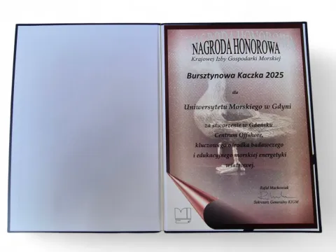 "Bursztynowa Kaczka" - nagroda Krajowej Izby Gospodarki Morskiej - została przyznana Uniwersytetowi Morskiemu w Gdyni za stworzenie Centrum Offshore UMG, kluczowego ośrodka, zalążka polskiej doliny offshore, realizującego badania i pomiary na morzu dla sektora MEW. Nagrodę wręczono w dniu 10 października 2025 roku podczas 25. edycji "Wspólnej Kaczki", wydarzenia, które zgromadziło ponad dwa tysiące zaproszonych gości i było zwieńczeniem Forum Gospodarki Morskiej.
